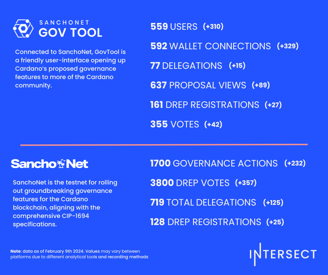 SanchoNet GovTool cho phép chủ sở hữu ADA trải nghiệm một số tính năng quản trị được mô tả trong CIP-1694 khi ở trong môi trường SanchoNet TestNet. GovTool đã chứng kiến lượng khách truy cập/người dùng tăng đều đặn kể từ khi ra mắt vào cuối năm 2023. Tuần này, GovTool có tổng cộng 589 người truy cập, tăng 47% so với tuần trước, mức tăng này cũng đồng nghĩa với việc tăng đề xuất và bỏ phiếu trên nền tảng. Nếu bạn muốn tham gia thử nghiệm các tính năng quản trị từ CIP-1694, hãy theo liên kết này.